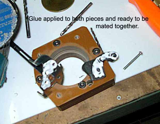 6) As shown in the last picture above, you must drill a 11/64 hole in the plastic were it's circled. Since there is a ramp there it's hard to drill because the drill just walks. You must grind some of the ramp away and make it flat. After you drill the hole, clamp the two pieces together in the vise and spot the hole in the metal using the plastic as a guide. Then take the plastic piece off and drill the hole you spotted all the way through the metal. Now bolt the two pieces together with the 8/32 screw and nut provided. While it's bolted together, cut off the excess length of screw with the cut off wheel. 7) Now take it apart again. Clean both surfaces and apply epoxy or some sort of super glue to them. Follow the instructions supplied with the glue you are using and put the two pieces back together when the time is right. Then put a drop of red loctite on the end of the screw and bolt it back together one last time. You are now done modifying the linkage!